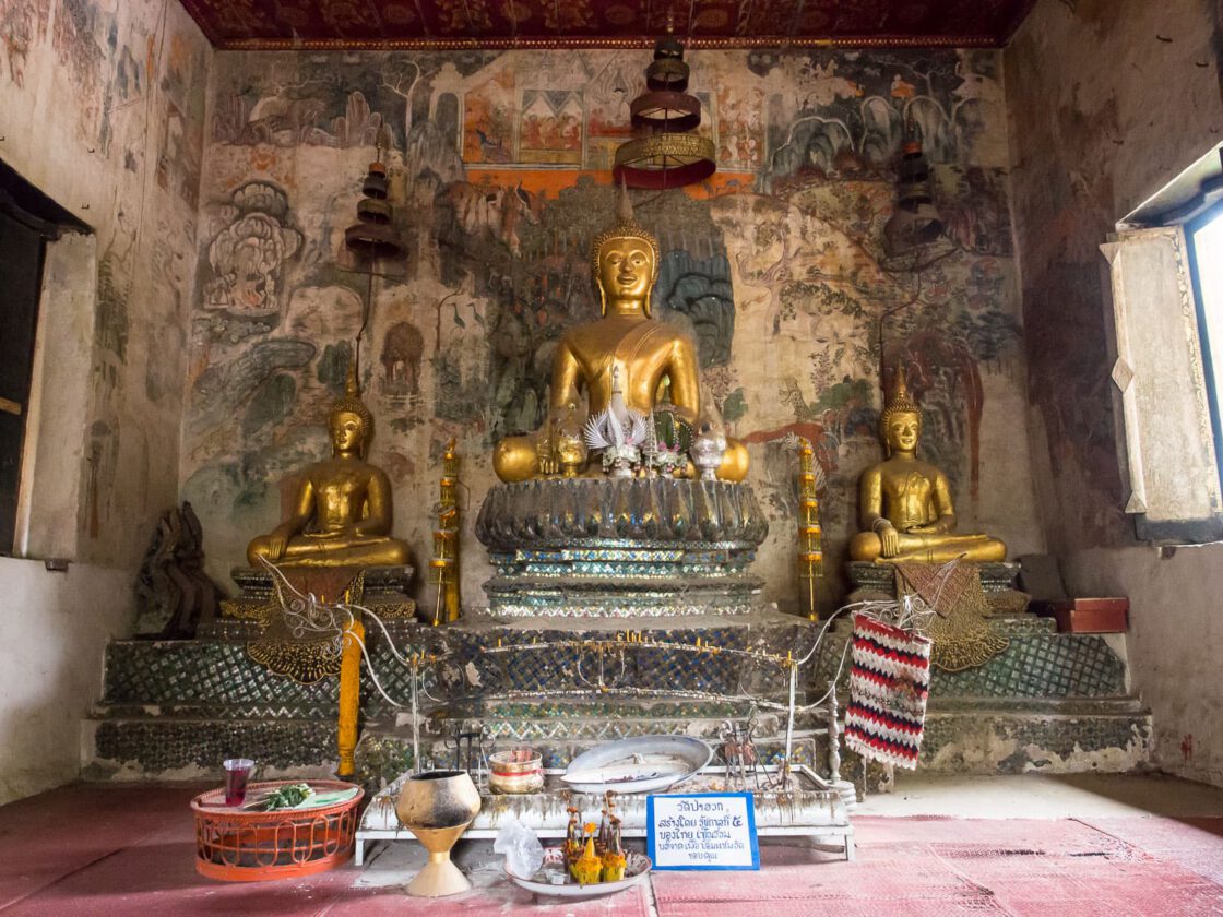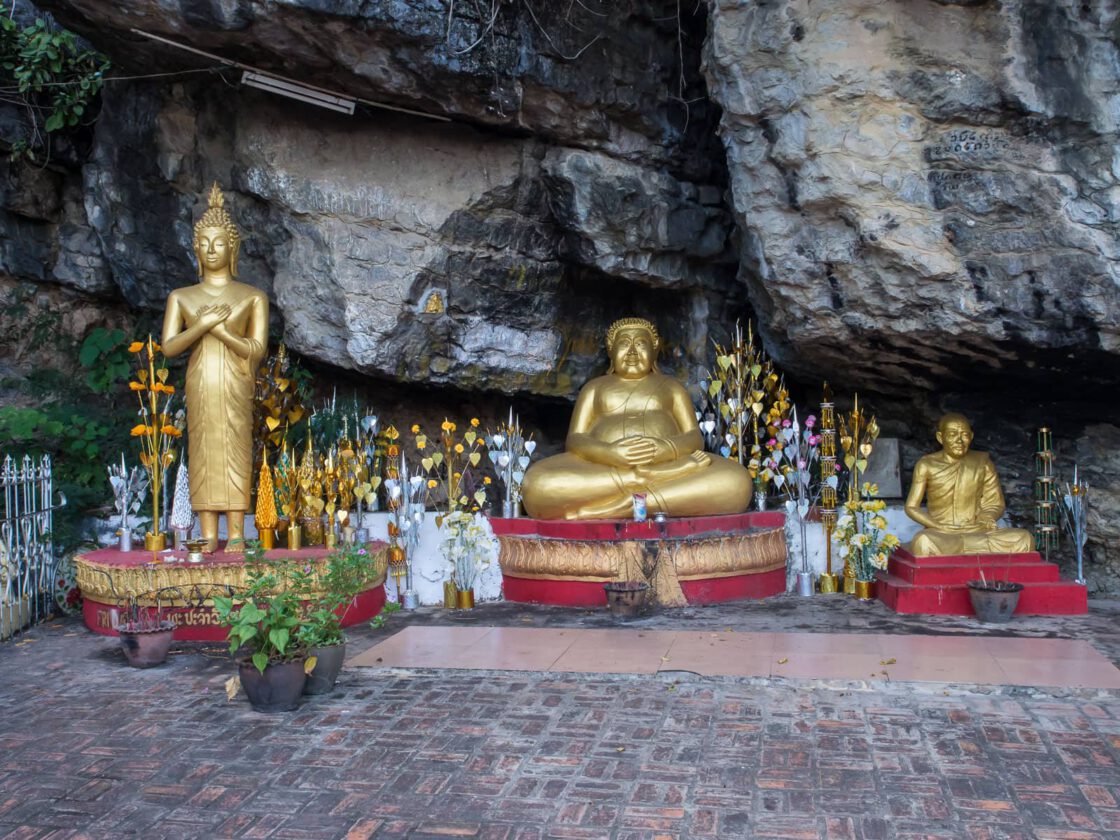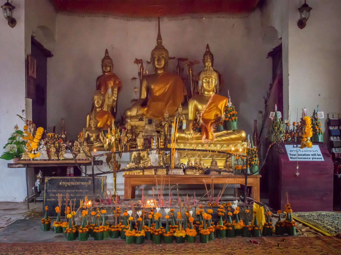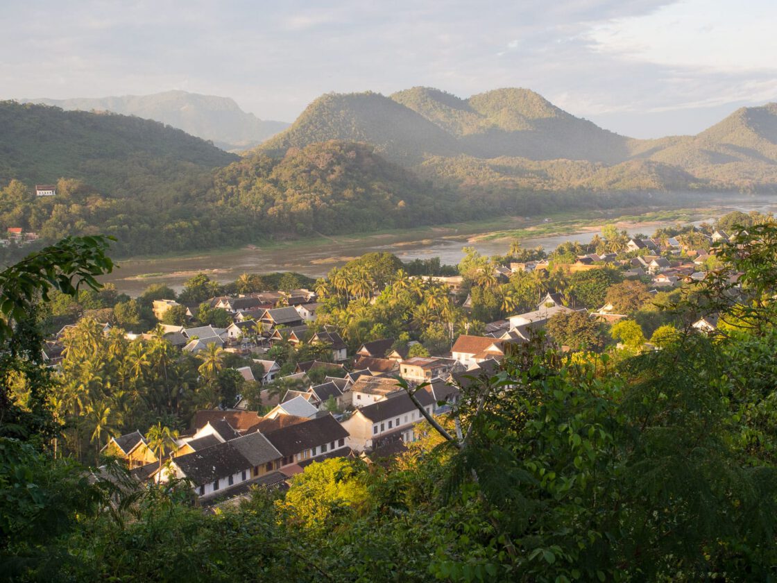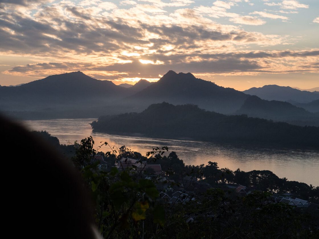 At the center of Luang Prabang is a 325-foot hill capped with a golden tower. Its rocky sides are dotted with old temples and gilded Buddha statues, while its summit is a popular spot for watching the sun rise and set over the rivers and mountains that surround the town. We got to Luang Prabang in the dark, and when we looked out of our bedroom window, our first real sight of the town was the lighted tower on Phousi Hill.