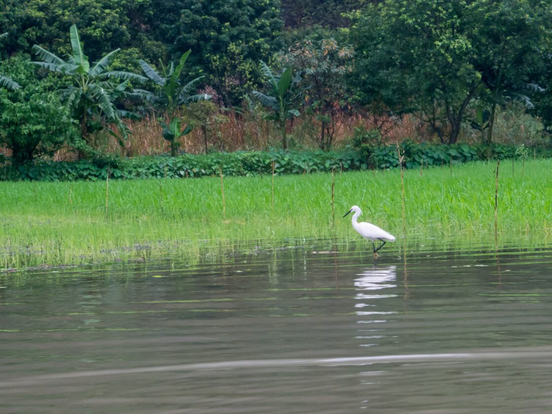 Ninety kilometers south of Hanoi, the small town of Tam Coc sits amid some of the most famous scenery in Vietnam: a series of tree-covered limestone hills rising from a plain of rivers and rice paddies. Small row boats---which local people often paddle with their feet---carry visitors on tours through this watery world. A popular river route starts in Tam Coc, just down the street from our hotel. For two hours, you can glide quietly down the river, the only sounds the slashing of oars and the calls of birds. The route leads through small caves, past shrines and rice fields dotted with water birds, into ever-wilder and more remote jungle landscapes. The misty rain that hung over the area while we were there made for a perfect atmosphere.